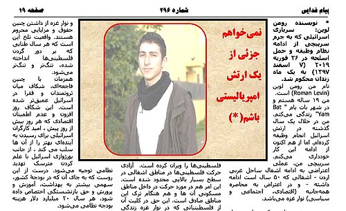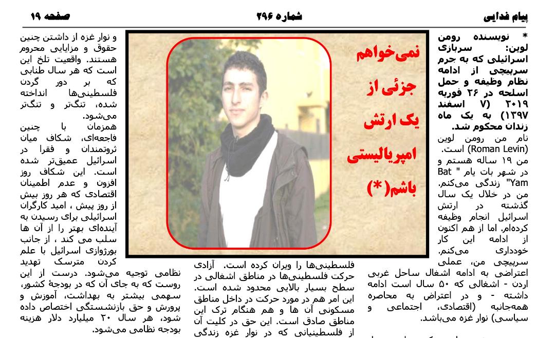 *نویسندهرومن لوین: سربازی اسرائیلی که به جرم سرپیچی از ادامه نظام وظیفه و حمل اسلحه در ۲۶ فوریه ۲۰۱۹ (۷ اسفند ۱۳۹۷) به یک ماه زندان محکوم شد.