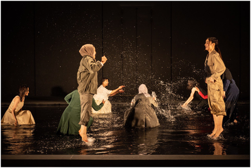 نه بازیگر زن افغانی، نقشهای مختلف نمایشنامه آنتیگونه سوفکل و همسرایان را ایفا میکنند. همچنانکه گفتم در پرولوگ نمایش دخترکی سیاهپوش کنار صحنه، بیرون از حوض آب نشسته و زن سیاهپوش دیگری قطعه شاعرانه ای درباره دختری که کنار پنجرهای با شیشههای شکسته نشسته و انتظار میکشد را بیان میکند و زنان دیگر کمکم به وسط صحنه و داخل حوض آب میآیند و در هیئت همسرایان کنار همدیگر در وسط صحنه میایستند.