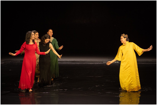 ته صحنه یک ماه بزرگ قرار گرفته، کف صحنه حوض چهارگوش بزرگ اما کم عمقی فرا گرفته است، عمق حوض تا قوزک پای زنان و وسعتی به اندازه مساحت تقریبی صحنه دارد. زنان از ابتدا تا انتها در این حوض بازی میکنند. ابتدای نمایش با ورود زنان با لباسهای بلند رنگارنگ به صحنه است، آنها با شادی به هم آب میپاشند و آب بازی می کنند و سپس به نوبت به سر تا پای تک تک زنان توسط گروه آب ریخته میشود و به این شکل نوعی غسل تعمید انجام میدهند. ناگهان نور میرود و خاموشی.