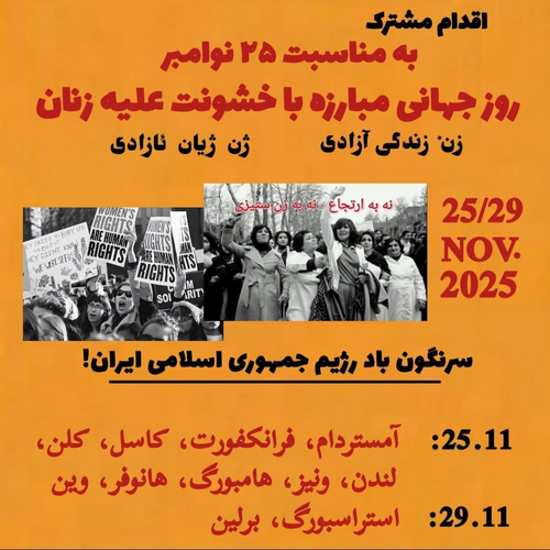 ما نهادها و کلکتیوهای چپ، دمکرات، فمینیست و کوئیر امضا کنندهی این فراخوان، بمناسبت روز جهانی "مبارزه با خشونت علیه زنان" در روز سه شنبه 25 نوامبر و شنبه 29 نوامبر 2025 برابر با 4 و 8 آذر 1404، در شهرها و در کشورهای مختلف جهان، به خیابان خواهیم آمد تا صدای خود را.در اعتراض به خشونت علیه زنان، علیه اعدام این قتل دولتی را به گوش جهانیان برسانیم.
