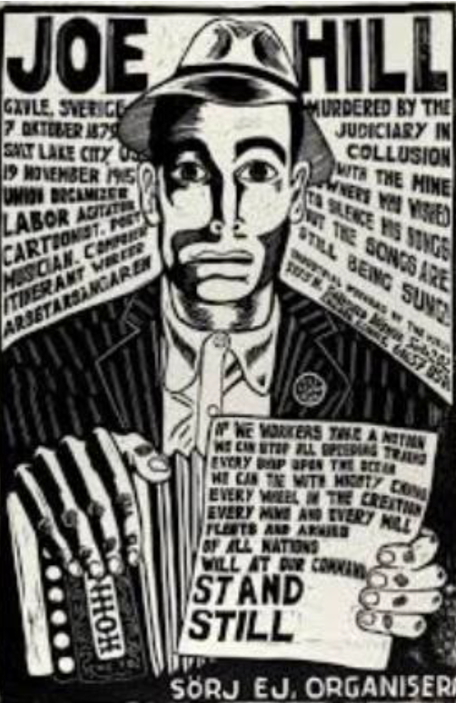 اشاره باری استیویس به مجسمه آزادی در بندر نیویورک ممکن است در زمانه ما عجیب به نظر برسد. اما زمانی که جو هیل، یا “یوئل هاگلوند” — همانطور که هنگام ترک شهر خود یوله در سال ۱۹۰۲ و ورود به آمریکا نام داشت — به آنجا رسید، مجسمه آزادی بود که با عبارت “آنان را که در زیر بار سنگین زنجیرها خسته شدهاند، بینوایانِ تو، تودههای فرورفته در ظلمت را برایم بیاور…” از میلیونها مهاجر استقبال میکرد.