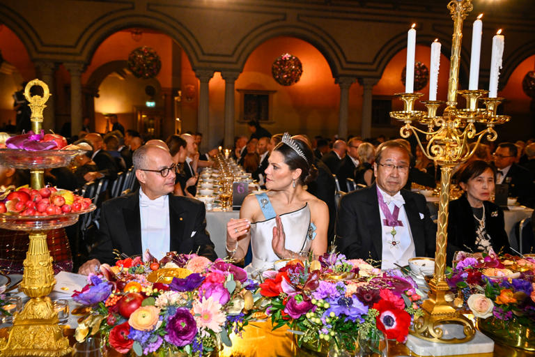 ولیعهد سوئد، شاهزاده ویکتوریا در ضیافت برندگان جایزه نوبل، عمر مونس یاغی و سوسومو کیتاگاوا را بر سر میز خود دارد. © کریستین اولسون/تی تی